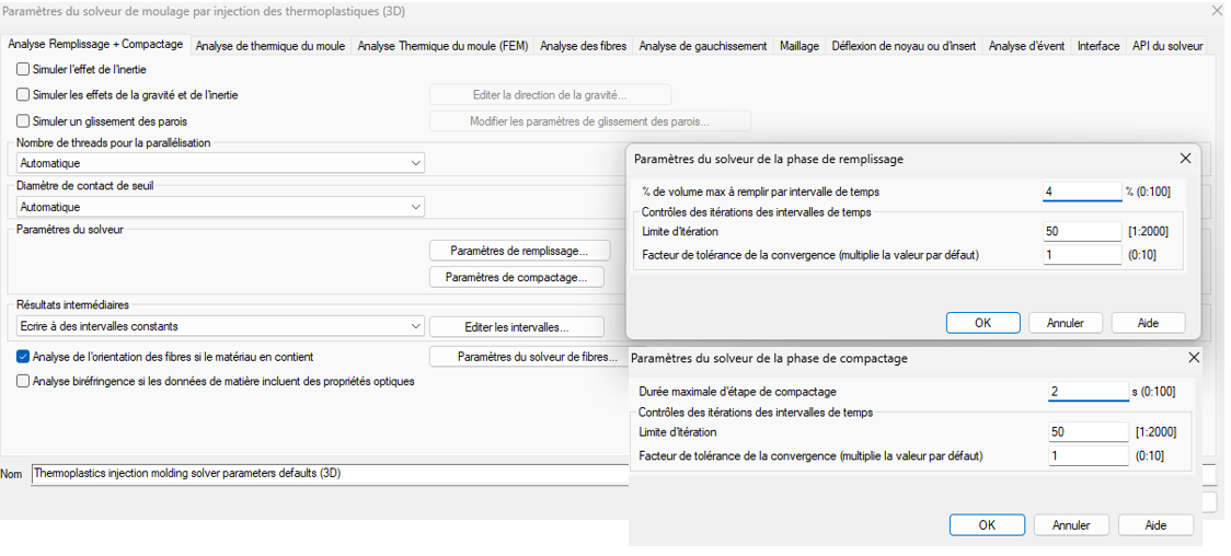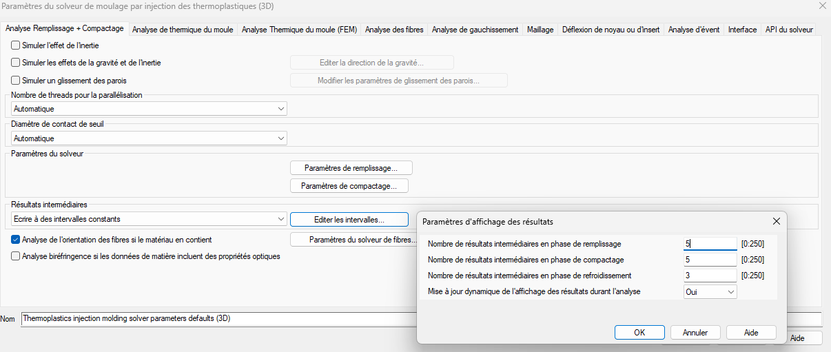 Dans Moldflow Insight, le nombre de résultats intermédiaires par défaut est de 5 pour les différentes phases du process d’injection. Cela peut se modifier dans les options avancées du solveur 3D de remplissage compactage (voir image ci-dessous)