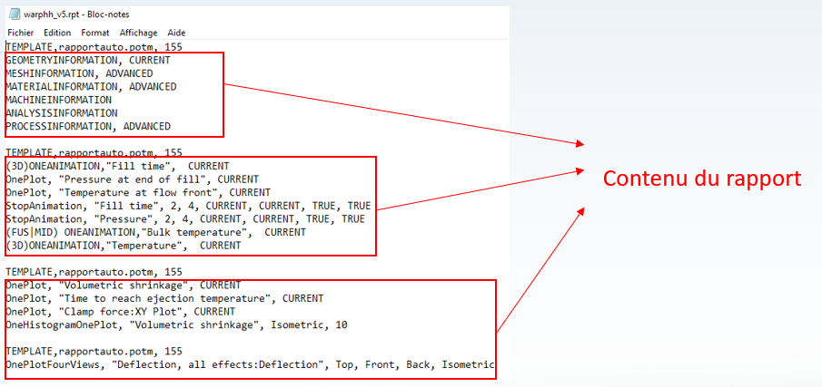 - Le fichier rapport « xxx.rpt » (des fichiers .rpt se trouvent dans C:\Program Files\Autodesk\Moldflow Synergy 2021.1\data\reports)