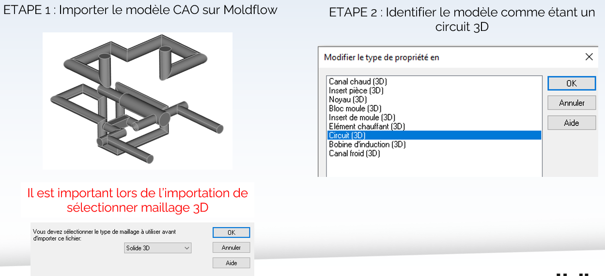 Moldflow permet de lancer des calculs de thermique afin d’évaluer l’efficacité de la régulation d’un outillage. Dans ce cadre, il est possible de transformer la CAO des circuits de régulation en filaire afin de les intégrer dans la simulation.
