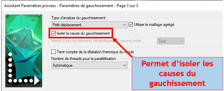 Moldflow permet de visualiser le gauchissement final d’une pièce après éjection. Cependant, il peut être difficile de distinguer si le gauchissement est principalement dû à un refroidissement différentiel, à un effet d’orientation ou bien au retrait volumique de la matière. Il existe une fonction dans le paramétrage process qui permet d’isoler les causes du gauchissement durant le calcul. La capture d’écran suivante montre comment accéder à cette option :