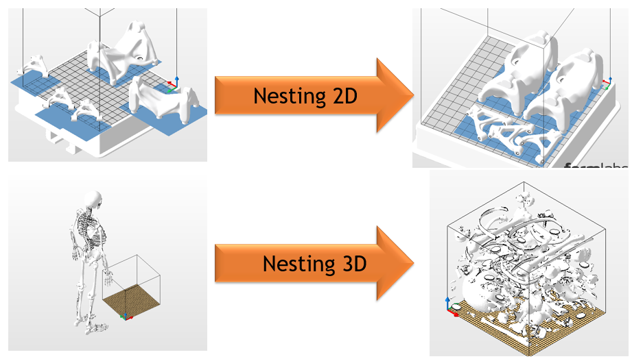 Le nesting est le positionnement optimal de plusieurs composants dans une surface de construction. Les enjeux du nesting dans le cadre de l’impression 3D sont d’éviter les collisions lors du positionnement des différentes pièces et de maximiser le nombre de pièces à imprimer dans un seul batch. Ce travail est fastidieux quand il doit être réalisé manuellement. Netfabb dispose d’outils de nesting automatique. 2 catégories de nesting automatiques sont disponibles :