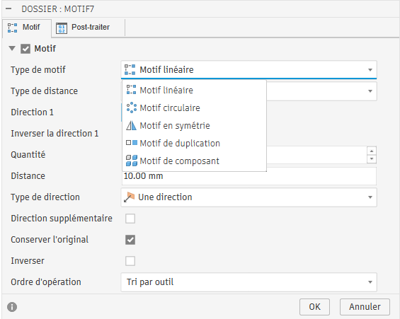 - Editez le motif, dans entrez dans le menu « post traiter » du motif :