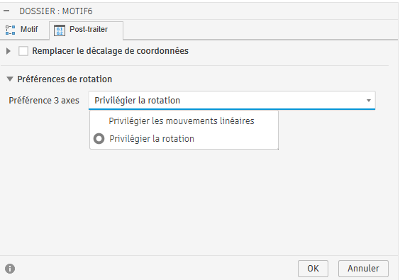 - Privilégier la rotation => vous activez alors, des rotations de l’axe C pour passer d’un parcours outils à l’autre, l’axe de rotation sera votre axe sélectionné dans le motif