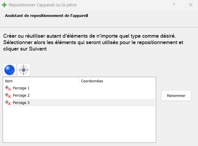 - Vous devez sélectionner à minima 3 item (3 perçages/points uniques ou 3 sphères) de référence :