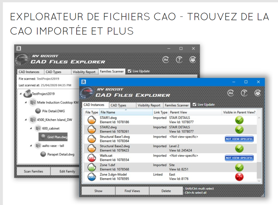 - Afficher tous les fichiers CAO (DWG, DXF, DGN, SKP, SAT) présents dans le projet ou les familles REVIT