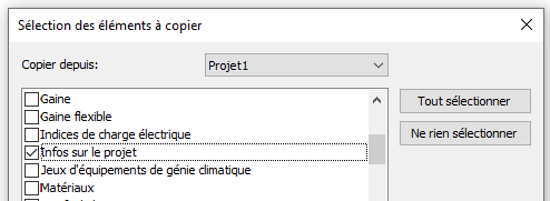- Dans l’onglet GERER => Transférer les normes du projet => Sélectionnez Informations sur le projet