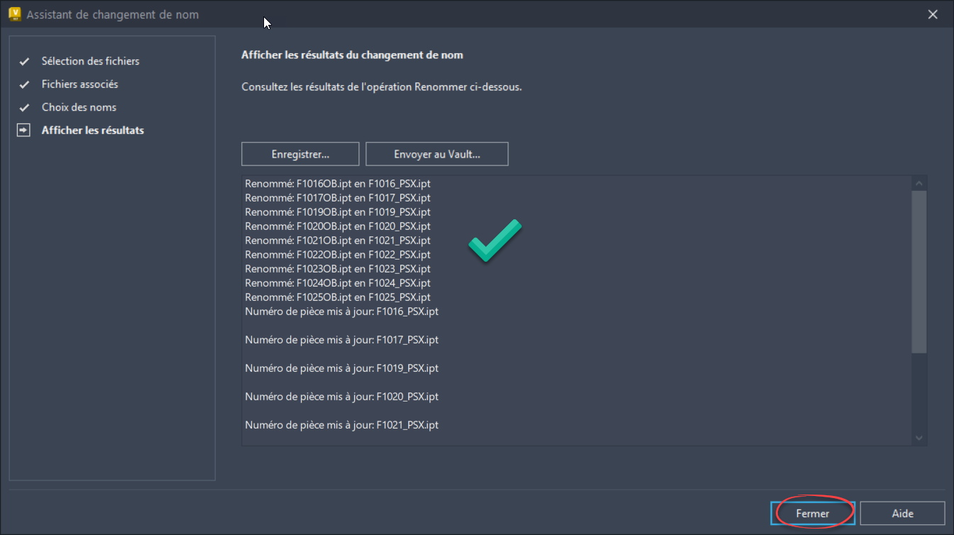 - Il est possible d'ajouter ou non Préfix et/ou Suffixe avec Incrément, Vault vérifie et met à jour automatiquement les références, associations et liens d’assemblages pour tous les fichiers renommés.