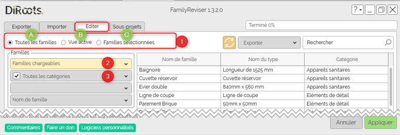- Pour commencer, vous pouvez choisir de préfiltrer ou non les familles ❶ :