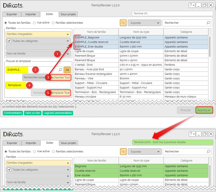 - Cliquez sur « Remplacer Tout» ❺ ou « Remplacer » si vous souhaitez remplacer une famille en particulier.