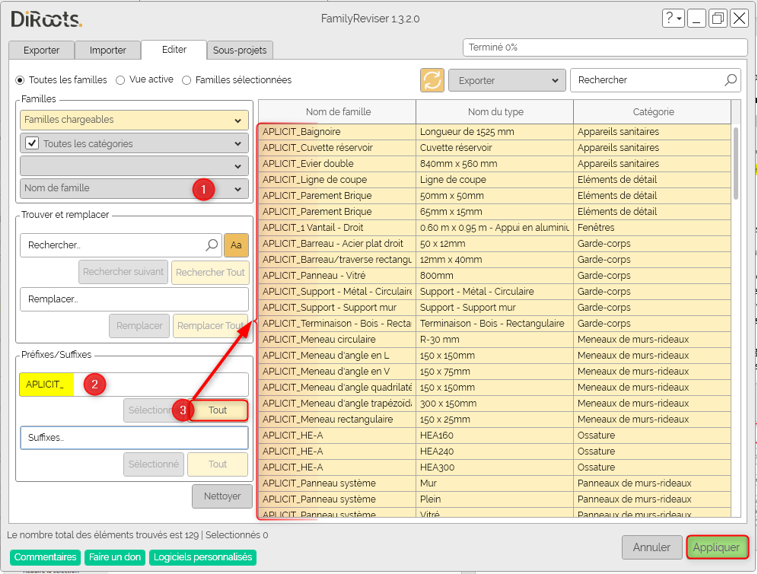 L’option « Tout » : applique l’ajout du « Préfixe / Suffixes » à l’ensemble des familles filtrées à l’aide des premières options.