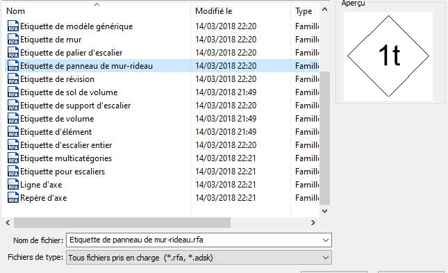On commence par charger une étiquette de panneau de mur-rideau (onglet « insérer », fonction « charger la famille », dossier « Annotation »)