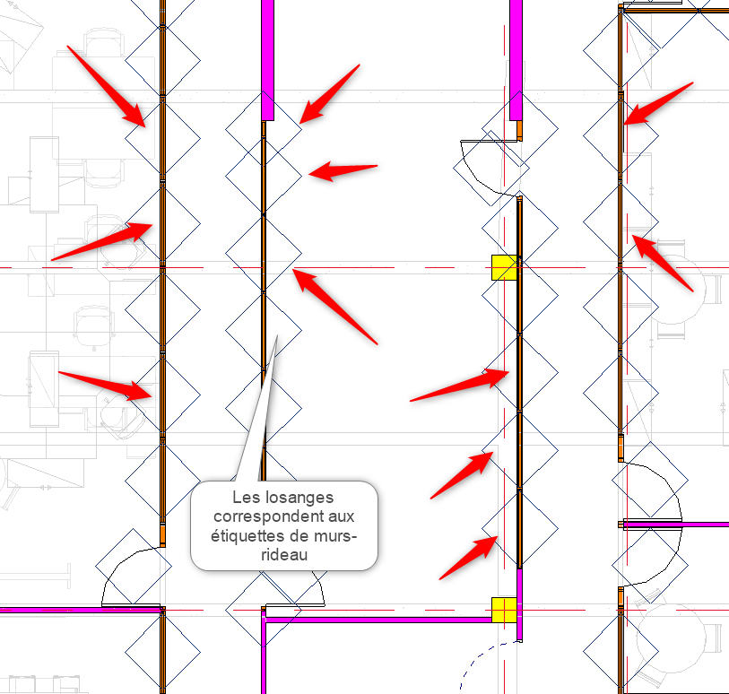 Et voilà, vos panneaux de mur-rideau sont étiquetés, ce qui permets au premier coup d’œil de vérifier l’adéquation des panneaux modélisés avec les exigences du projet :
