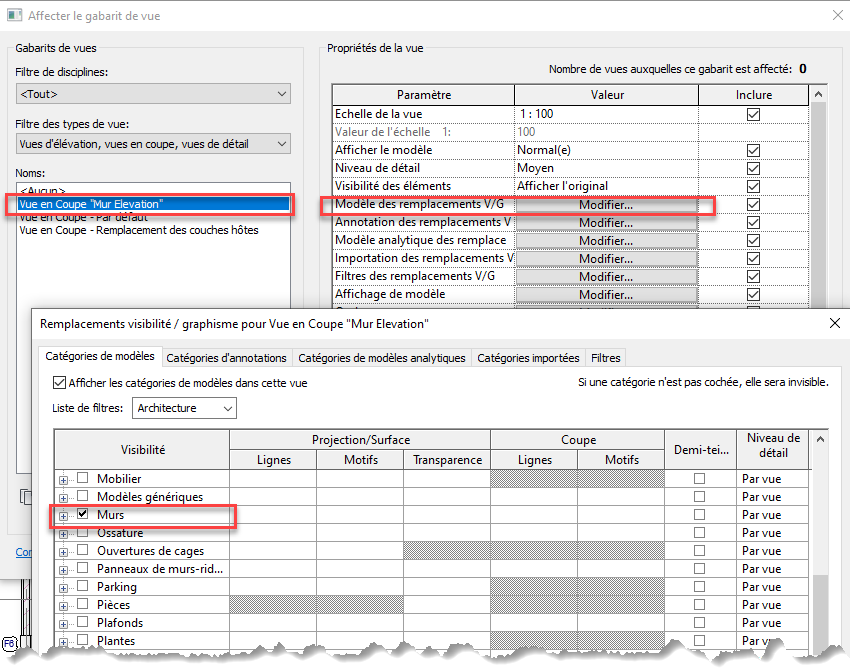 On Décoche la case Visibilité et les "Coupes" "Mur_Elevation" seront masqués dans la vue.