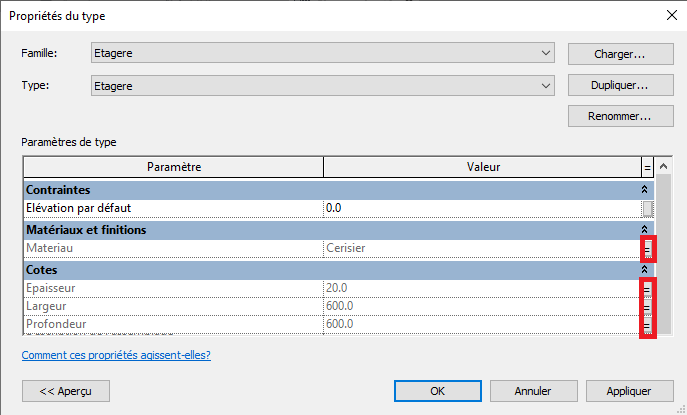 La famille d’étagère héritera automatiquement des dimensions de la famille hôte (Epaisseur, Largeur, Profondeur, Materiau).