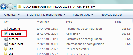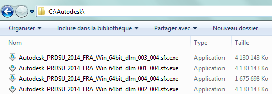 Les fichiers d'installation (32 ou 64bits) seront téléchargés dans le dossier C:\Autodesk\Autodesk_PRDSU_2014_FRA_Win_64bit_dlm (ici pour Autodesk Product Design Suite Ultimate)
