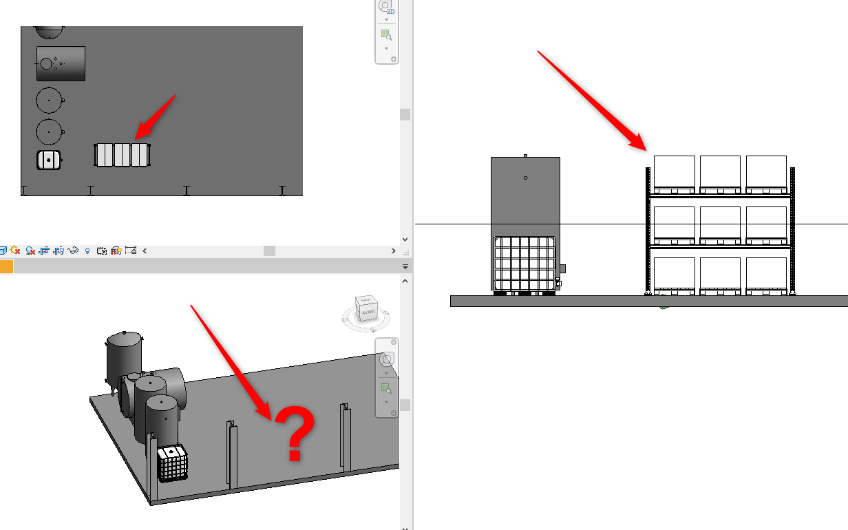 Ici, dans cette vue en mosaïque, l’objet est bien visible dans la vue en plan et dans la coupe, mais pas dans la vue 3D.