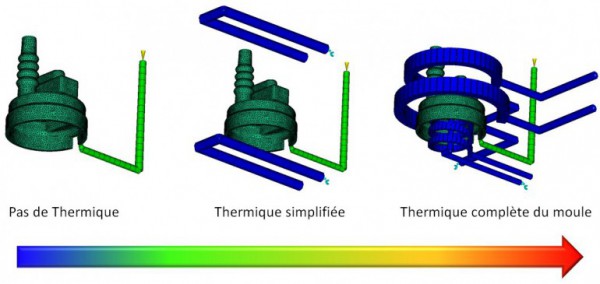 Effectivement il est souvent compliqué de modéliser la thermique qui sera implantée dans l’outillage, pour la bonne raison que celle-ci sera seulement mise en place une fois les problématiques de cinématique moule réglées (l’important est avant tout de pouvoir sortir la pièce !), ce qui n’est le plus souvent le cas qu’en fin de développement.